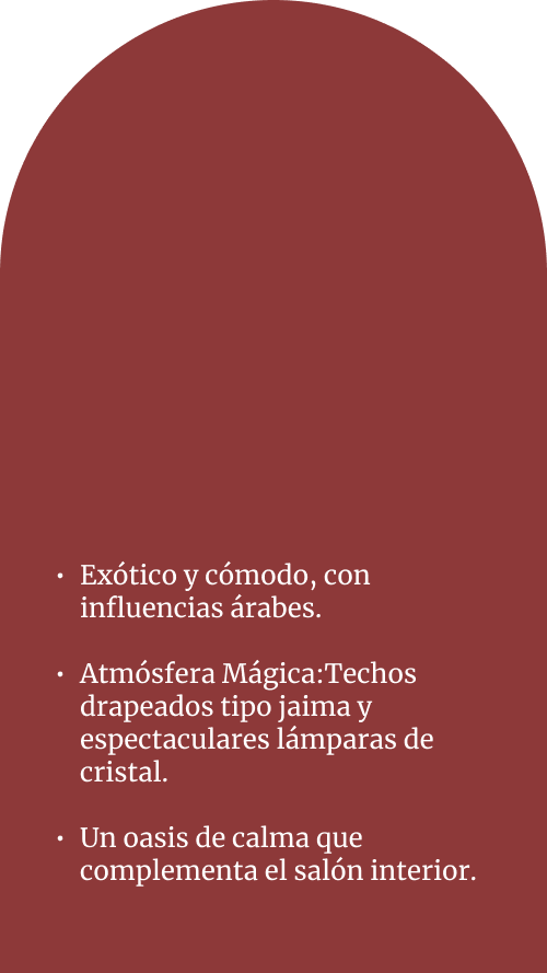 Adentrarse en el Salón Mozárabe es viajar a un lugar mágico. Sus altos techos, elegantemente drapeados a modo de jaima, y sus espectaculares lámparas de cristal crean un ambiente de hechizo y sofisticación. Es un espacio envolvente, perfecto para eventos que buscan una atmósfera íntima y con un carácter muy especial.