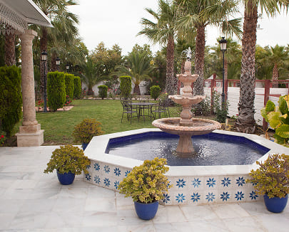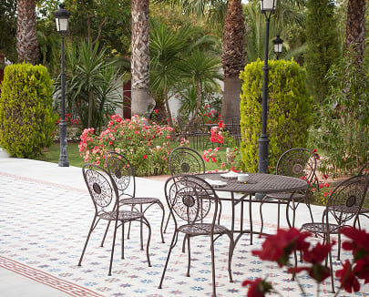 Este ambiente de ensueño se prolonga en sus Cuidados Jardines privados, un oasis de serenidad donde los invitados pueden disfrutar del murmullo del agua de las fuentes, rodeados de una frondosa vegetación. La combinación del salón y sus jardines crea un refugio exclusivo y lleno de encanto.