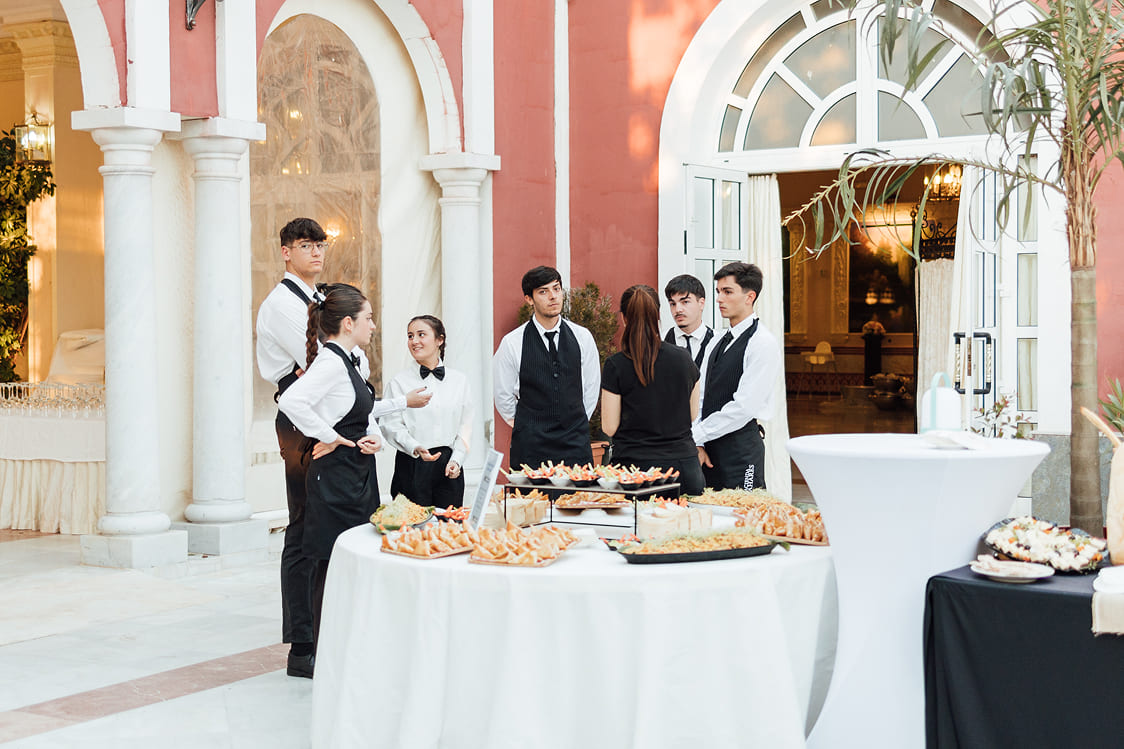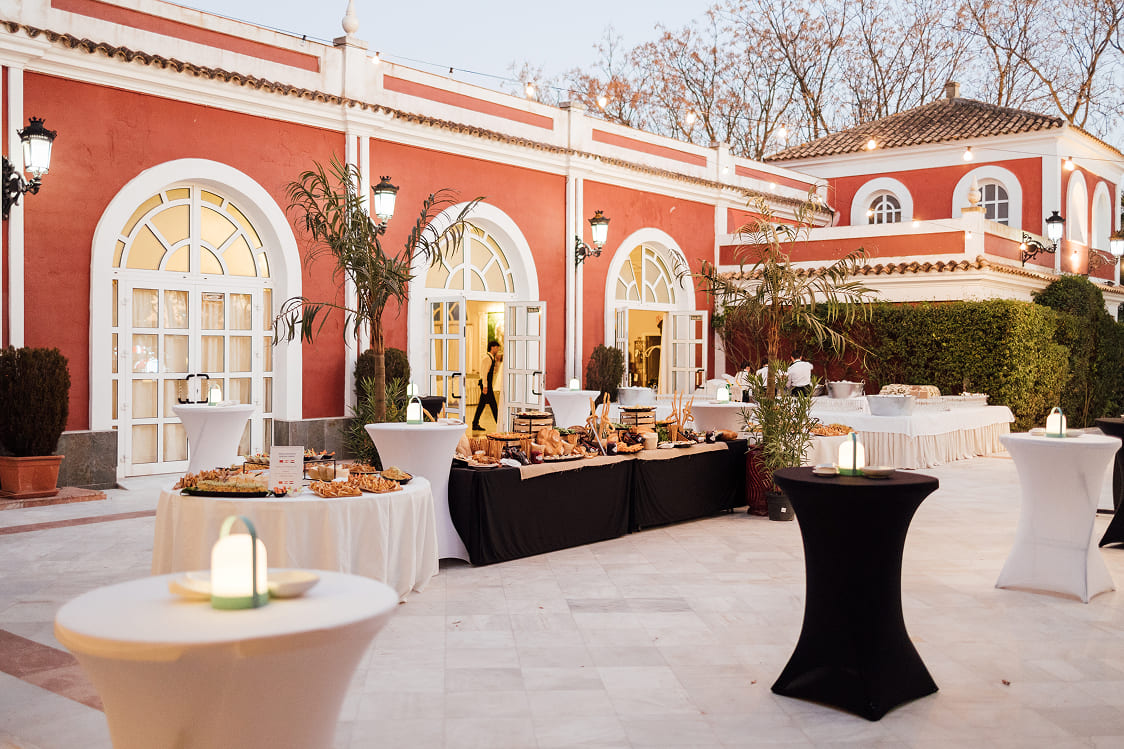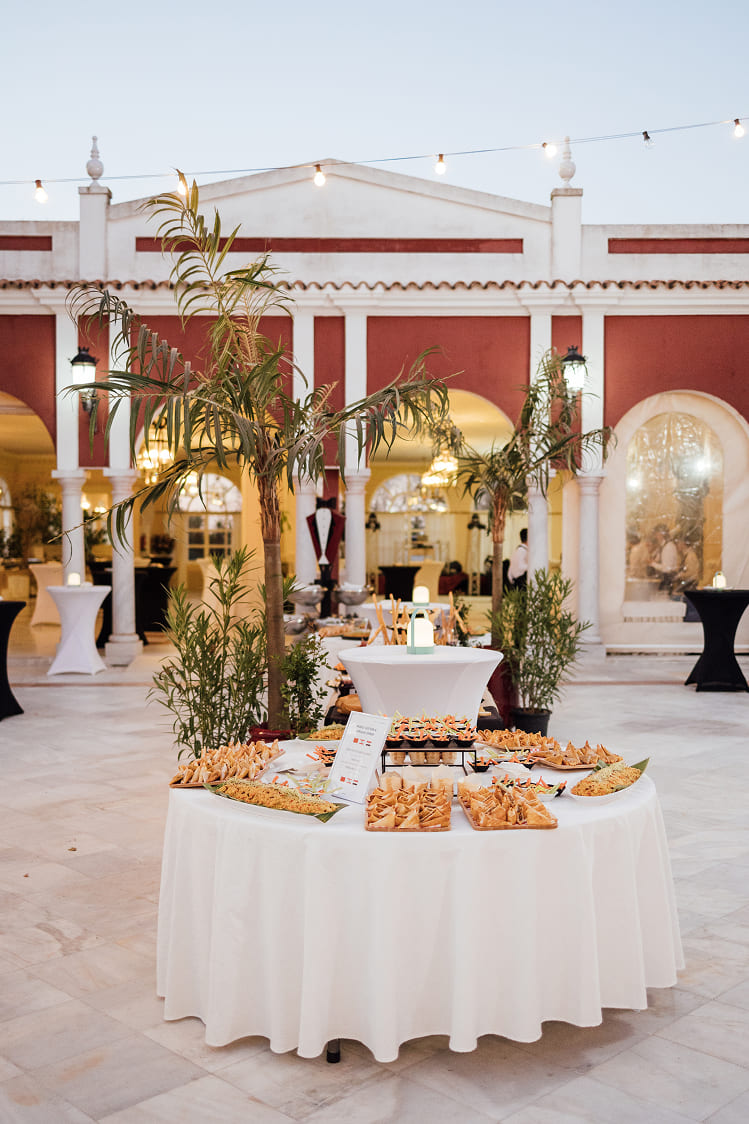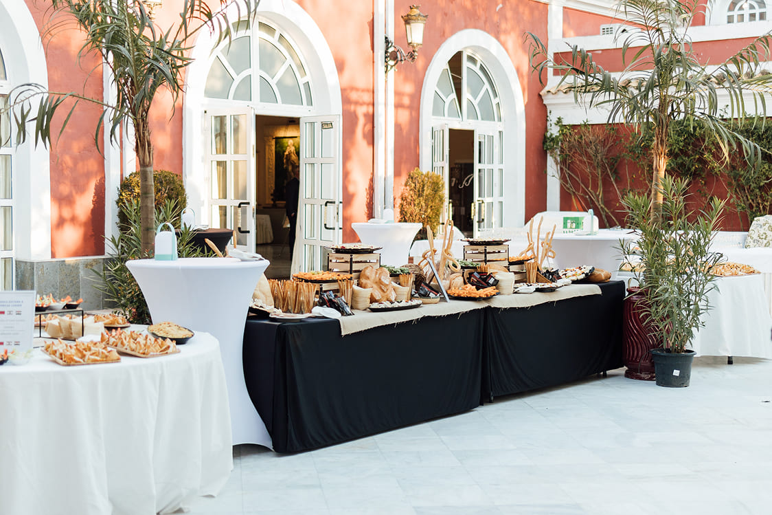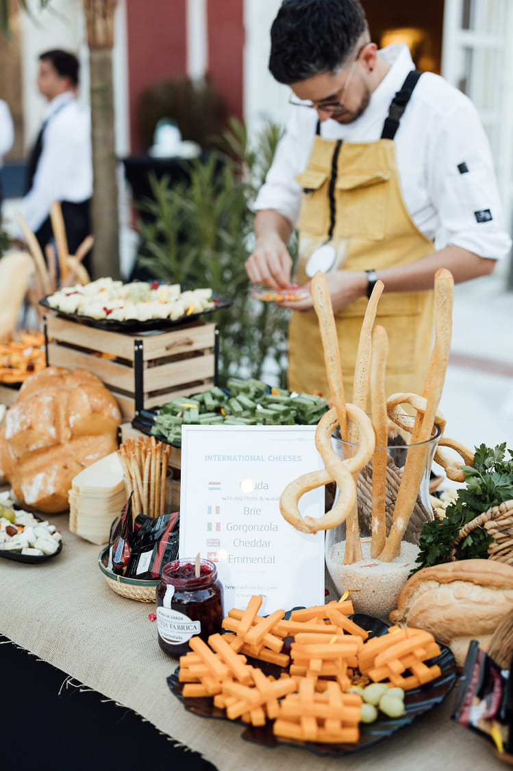 Nuestra Solución: Diseñamos un concepto audaz: «Un Viaje Gastronómico por el Mundo». Transformamos el Complejo Versalles en un recorrido por diferentes «rincones» culinarios. El Patio y la Terraza se llenaron de vida con estaciones temáticas como el «Rincón de Quesos Internacionales», el «Rincón de Oriente Medio y África» o el «Punto de Sabores Asiáticos», permitiendo a los invitados explorar, degustar e interactuar.